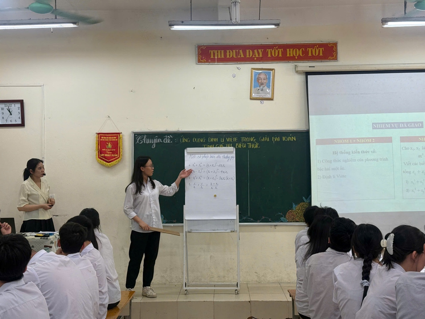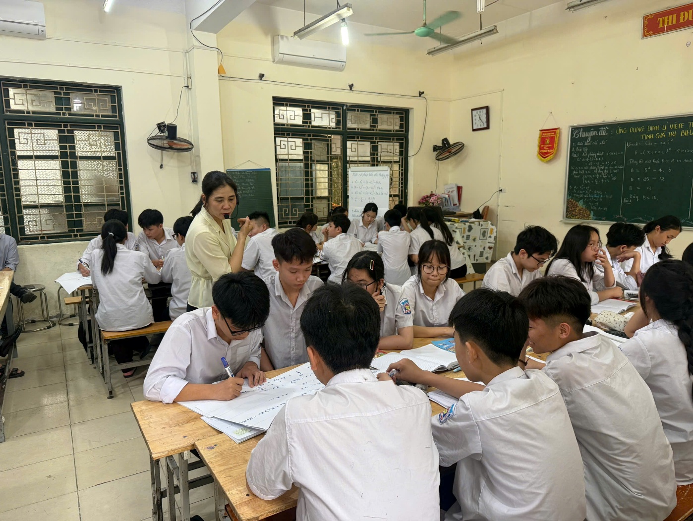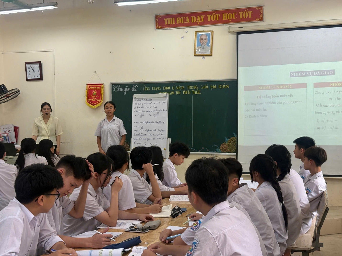Trong tiết học, cô giáo đã hệ thống lại một cách ngắn gọn, rõ ràng nội dung của định lí Viète, đồng thời làm nổi bật mối liên hệ giữa tổng, tích hai nghiệm với các hệ số của phương trình bậc hai. Trên cơ sở đó, học sinh được hướng dẫn cách nhận diện và vận dụng linh hoạt định lí để biến đổi, rút gọn và tính giá trị biểu thức một cách nhanh gọn, thông qua các ví dụ tiêu biểu sát với dạng bài trong đề thi vào lớp 10, từ đó hạn chế những phép tính phức tạp không cần thiết.