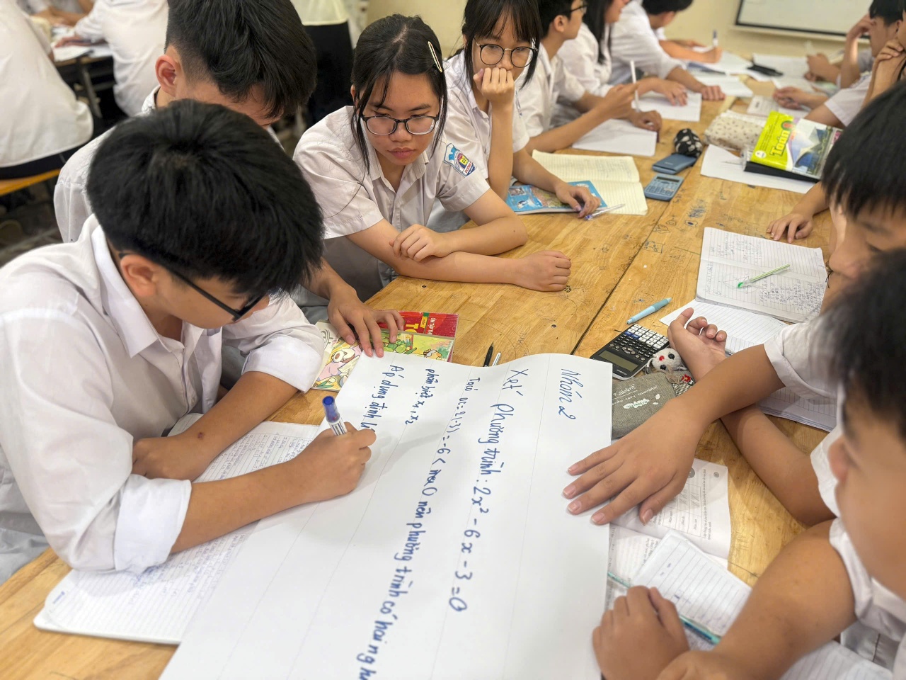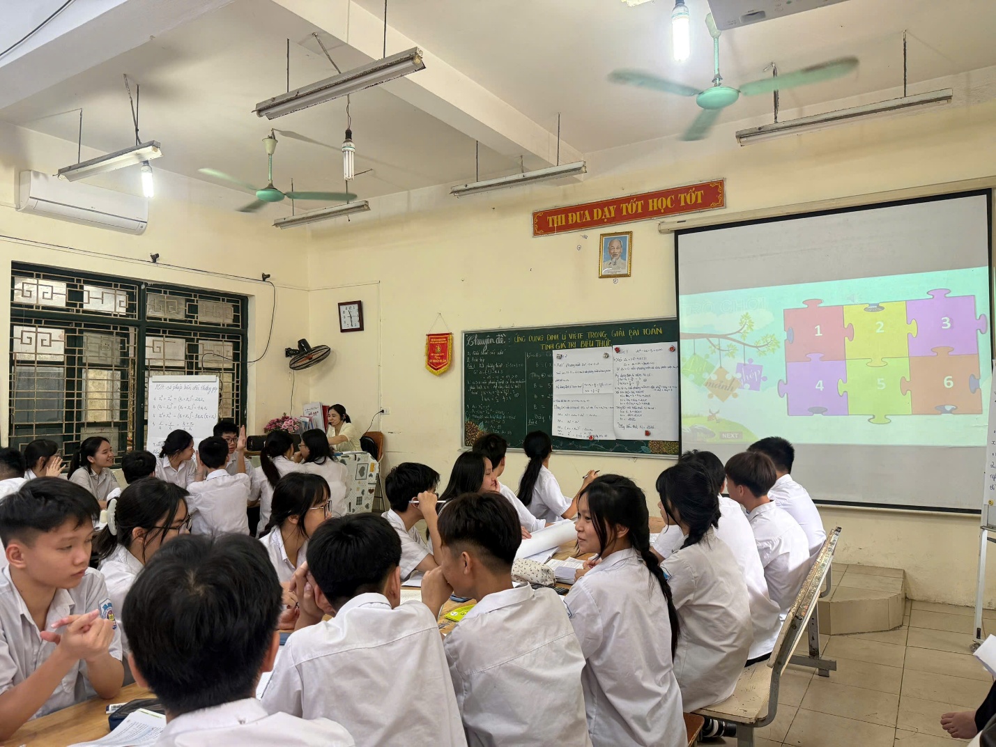 Bên cạnh nội dung chuyên môn vững chắc, bài giảng còn được thiết kế khoa học, rõ ràng và trực quan, giúp học sinh dễ dàng theo dõi và tiếp nhận kiến thức. Cách dẫn dắt tự nhiên, kết hợp linh hoạt giữa lí thuyết và ví dụ minh họa đã tạo nên sự cuốn hút cho tiết học. Nhờ đó, không khí lớp học luôn sôi nổi, cởi mở; nhiều học sinh chủ động trao đổi, mạnh dạn đặt câu hỏi và đưa ra những cách giải khác nhau, thể hiện sự hiểu bài sâu sắc và tư duy sáng tạo.