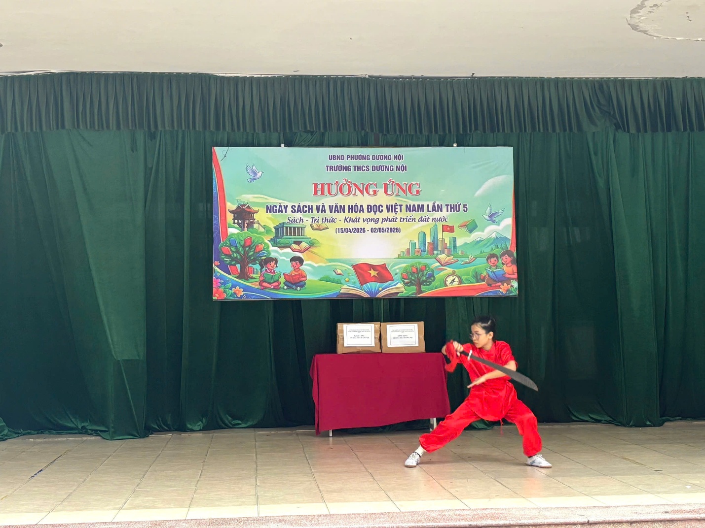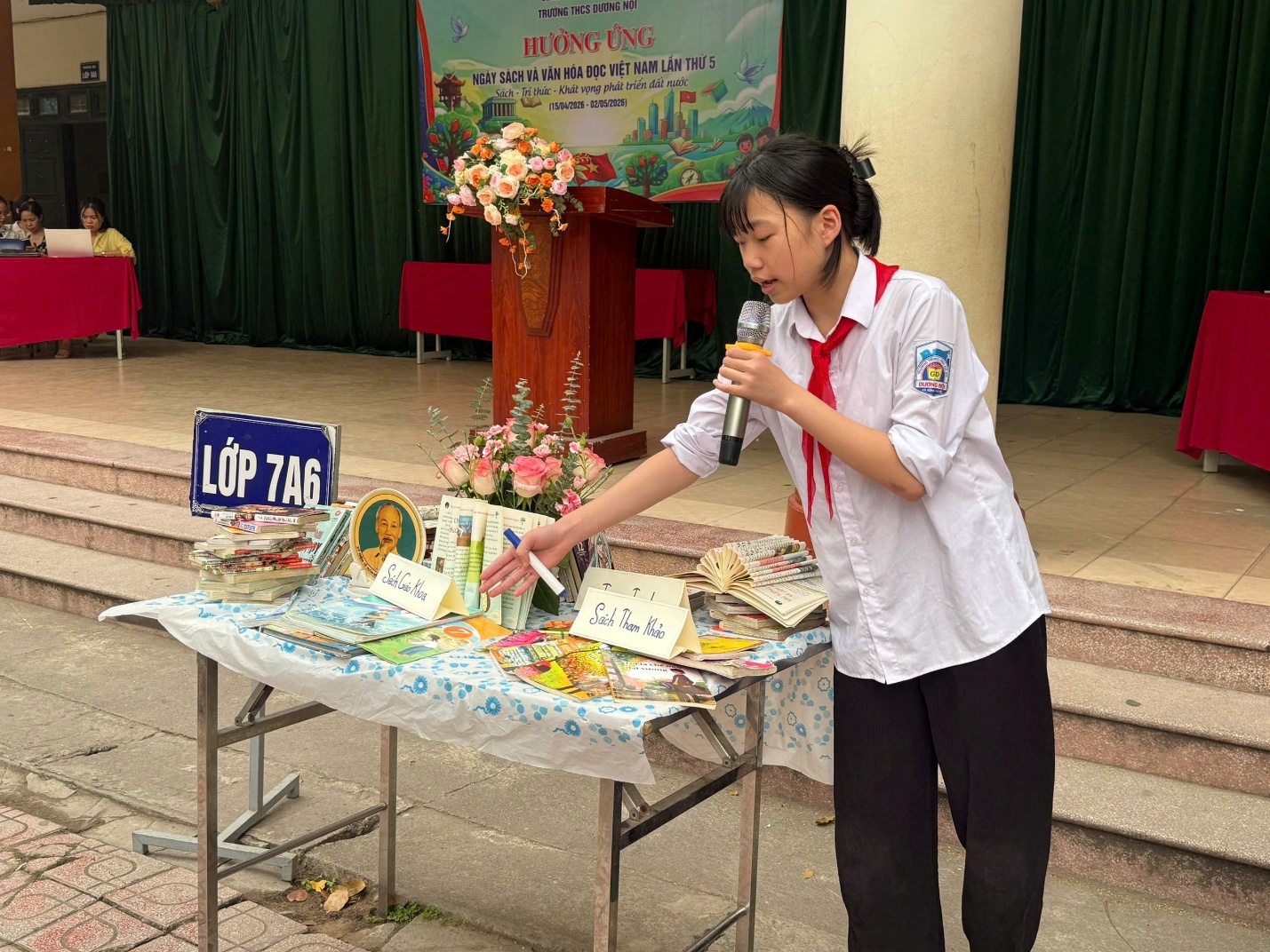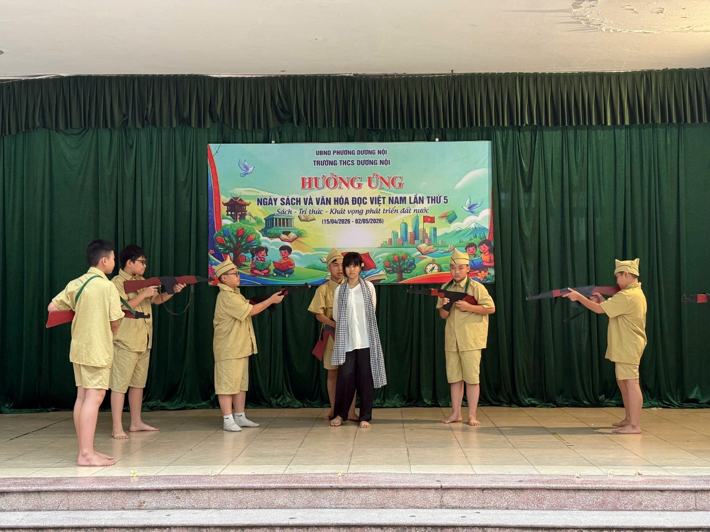 HƯỞNG ỨNG NGÀY SÁCH VÀ VĂN HÓA ĐỌC VIỆT NAM LẦN THỨ 5 Hòa chung không khí hào hùng của tháng Tư lịch sử – tháng của những dấu mốc trọng đại của dân tộc, Trường THCS Dương Nội đã tích cực hưởng ứng Ngày Sách và Văn hóa đọc Việt Nam (21/4) bằng chuỗi hoạt động phong phú, thiết thực và đầy ý nghĩa. Với chủ đề “Sách – Tri thức – Khát vọng phát triển đất nước”, phong trào đã thực sự trở thành điểm nhấn nổi bật, lan tỏa mạnh mẽ tình yêu sách trong toàn thể học sinh. Sách từ lâu đã là người bạn đồng hành không thể thiếu trong hành trình học tập và trưởng thành của mỗi học sinh. Mỗi trang sách không chỉ mở ra những chân trời tri thức mới mà còn nuôi dưỡng tâm hồn, bồi đắp nhân cách và khơi dậy những ước mơ, hoài bão đẹp đẽ.Từ những giá trị đó, việc đọc sách không còn dừng lại ở tiếp nhận kiến thức mà còn trở thành nguồn cảm hứng để học sinh sáng tạo, thể hiện suy nghĩ và cảm nhận của mình theo nhiều hình thức phong phú. Chính điều này đã được thể hiện rõ nét trong các hoạt động hưởng ứng Ngày Sách tại nhà trường. Mở đầu cho chuỗi hoạt động sôi nổi ấy, học sinh khối 6 đã mang đến những phần thi giới thiệu sách bằng hình thức sân khấu hóa đầy màu sắc và hấp dẫn. Nhiều lớp thể hiện sự đầu tư công phu từ khâu lựa chọn tác phẩm phù hợp, xây dựng kịch bản chặt chẽ đến chuẩn bị trang phục, đạo cụ và tổ chức biểu diễn.Các tiết mục không chỉ dừng lại ở việc kể lại nội dung sách mà còn biết sáng tạo trong cách thể hiện, kết hợp hài hòa giữa lời thoại, diễn xuất và âm nhạc. Nhờ đó, nội dung tác phẩm được tái hiện một cách sinh động, gần gũi, giúp người xem dễ dàng cảm nhận và hiểu rõ hơn giá trị của cuốn sách, đồng thời truyền tải những thông điệp ý nghĩa một cách tự nhiên, sâu sắc. Tiếp nối mạch cảm hứng từ hoạt động của khối 6, khối 7đã mang đến một màu sắc hoàn toàn khác với hội thi xếp sách nghệ thuật giàu tính sáng tạo. Từ những cuốn sách quen thuộc, các lớp đã khéo léo sắp đặt, tạo hình thành những mô hình độc đáo, thể hiện rõ ý tưởng và thông điệp mà tập thể muốn gửi gắm.Điểm nổi bật của phần thi không chỉ nằm ở sự chắc chắn trong kết cấu hay tính thẩm mỹ của sản phẩm, mà còn ở cách các em “thổi hồn” vào từng mô hình thông qua nội dung gắn với tri thức, ước mơ và cuộc sống. Qua đây, mỗi sản phẩm không chỉ là một hình thức trưng bày mà còn trở thành một câu chuyện có ý nghĩa. Bên cạnh đó, phần thuyết trình đã góp phần hoàn thiện giá trị của sản phẩm. Nhiều học sinh thể hiện phong thái tự tin, diễn đạt rõ ràng, biết dẫn dắt người nghe theo mạch ý tưởng của mình, từ đó tạo nên sức thuyết phục và dấu ấn riêng cho từng tập thể lớp. Không chỉ dừng lại ở đó, khối 8 tiếp tục góp phần làm phong phú phong trào bằng phần thi xây dựng video cảm nhận về sách. Nhiều sản phẩm được đầu tư sáng tạo, kết hợp tốt giữa nội dung và hình thức thể hiện.Các video không chỉ giới thiệu cuốn sách mà còn thể hiện cảm nhận riêng của học sinh, góp phần làm nổi bật giá trị của tác phẩm. Qua hoạt động này, học sinh được rèn luyện kỹ năng trình bày, ứng dụng công nghệ và nuôi dưỡng tình yêu đối với việc đọc sách. Khép lại chuỗi hoạt động với nhiều dấu ấn ý nghĩa, học sinh khối 9 đã lan tỏa tinh thần nhân văn qua hoạt động quyên góp sách với thông điệp “Trao tri thức – Gửi yêu thương”. Phong trào nhận được sự hưởng ứng tích cực, với số lượng sách phong phú, đa dạng về thể loại và đảm bảo chất lượng.Đáng trân trọng là nhiều học sinh đã chủ động lựa chọn những cuốn sách còn mới, có giá trị để đóng góp, thể hiện tinh thần tự giác và ý thức sẻ chia. Qua đó, hoạt động không chỉ góp phần làm phong phú nguồn sách cho thư viện mà còn lan tỏa tình yêu tri thức và bồi dưỡng lòng nhân ái trong học sinh. Trong không khí hưởng ứng Ngày Sách và Văn hóa đọc Việt Nam lần thứ 5, Trường THCS Dương Nội vinh dự nhận được sự quan tâm, đồng hành từ các đơn vị xuất bản và nghiên cứu giáo dục.Nhà trường đã đón nhận món quà ý nghĩa là những đầu sách do Nhà xuất bản Giáo dục Việt Nam trao tặng. Buổi trao tặng có sự tham gia của ông Phùng Quảng Sơn – cán bộ Viện Nghiên cứu Sách và Học liệu giáo dục và cô Nguyễn Thị Hải Yến – Bí thư chi bộ, Hiệu trưởng nhà trường. Đây không chỉ là nguồn tài liệu học tập quý giá, góp phần làm phong phú thêm thư viện mà còn là món quà tinh thần thiết thực, khơi dậy niềm đam mê đọc sách và ý thức tự học trong học sinh, góp phần lan tỏa tình yêu sách và tri thức trong môi trường học đường. Có thể khẳng định rằng, phong trào hưởng ứng Ngày Sách và Văn hóa đọc Việt Nam lần thứ 5 tại Trường THCS Dương Nội đã diễn ra th