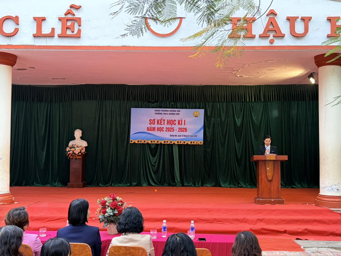 Tại buổi lễ, đại diện Ban Giám hiệu đã trình bày báo cáo sơ kết học kỳ I năm học 2025–2026, trong đó nêu rõ những kết quả nổi bật mà nhà trường đạt được trên các lĩnh vực: công tác quản lý, chất lượng dạy học, rèn luyện đạo đức, xây dựng nền nếp kỷ cương, cũng như việc tổ chức các hoạt động giáo dục ngoài giờ lên lớp và phong trào thi đua.